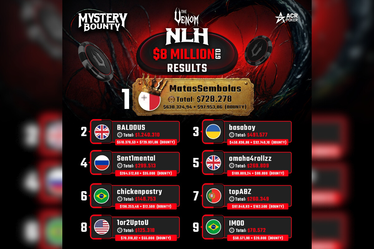 “The Mystery Bounty Venoms had it all – huge fields, nonstop action, and unforgettable moments – and showed why it’s one of the most exciting formats in online poker,” said ACR Pro Chris Moneymaker. “Congratulations to all the winners and to everyone who landed those incredible bounties – now bring on the next one!”